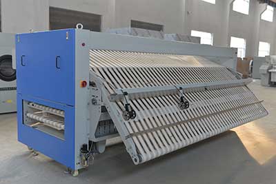 上航洗滌機(jī)械床單折疊機(jī)折疊后,層數(shù)增加,厚度增加。基本上采用正反轉(zhuǎn)和機(jī)械刀盤結(jié)構(gòu),能可靠完成布的折疊。一些折疊機(jī)采用簡(jiǎn)單的升降板結(jié)構(gòu)折疊四次,但織物由輸送帶推出,折疊縫差,織物的厚度大不相同,因此不推薦使用。